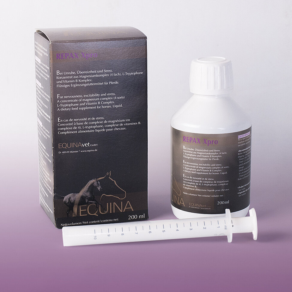 EQUINA Repax Xpro stabilisiert aufgrund seiner Zusammensetzung den Nervenstoffwechsel, wodurch die nervliche Belastbarkeit in Training, Wettkampf oder anderen Stresssituationen wieder hergestellt wird.